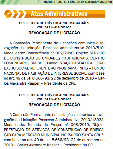 A Prefeitura de Luís Eduardo Magalhães publicou editais, nesta quarta-feira, 22, anulando licitações, com base no artigo 49 da Lei 8.666. Diz o seguinte tal artigo: