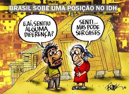 Dizem que o ex-presidente Lula da Silva ficou “uma arara” com a avaliação do Programa das Nações Unidas para o Desenvolvimento (PNUD) que classificou o Brasil apenas um degrau acima no Índice de Desenvolvimento Humano (IDH). O País passou de 85º para 84º lugar entre os 167 países pesquisados. Lula e o Governo criticam o método desde o ano passado.
