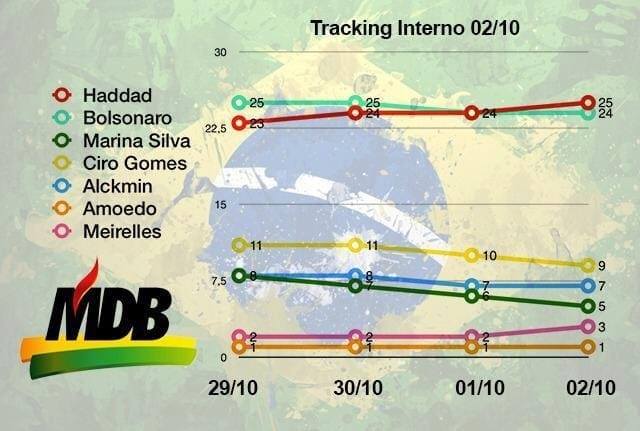 Desde a semana passada, o trecking do MDB mostra Haddad emparelhado com Bolsonaro. Hoje, mostra Haddad acima. Trackings são consultas feitas diariamente pelos partidos.