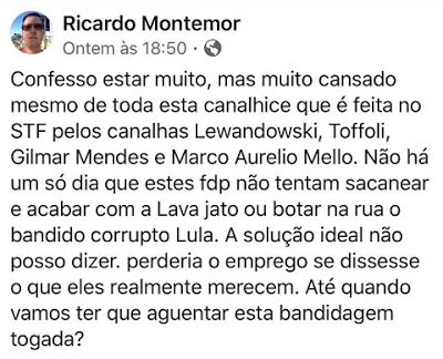 A corregedoria do Ministério Público de São Paulo vai instaurar uma reclamação disciplinar para investigar os xingamentos postados na terça (24) pelo promotor Ricardo Montemor em uma rede social. O procurador de Justiça apagou sua página, mas o STF já tinha tomado conhecimento das ofensas graves e gratuitas. Agora o rapazote vai acertar as contas com a Justiça.