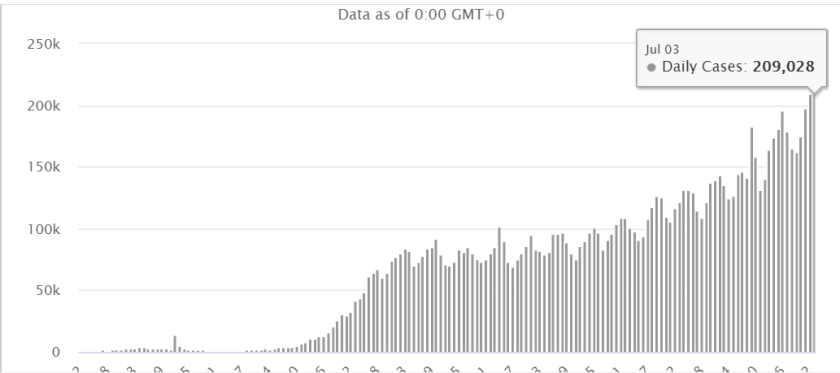 O mundo registrava 11.271.224 casos de contágio com o Coronavírus agora ao meio-dia. Destes, 4.353.735 eram casos ativos, com 58.817 casos graves (1%). O número de mortes registrados era de 530.493. O Brasil é o segundo em casos registrados e também no número de mortes.