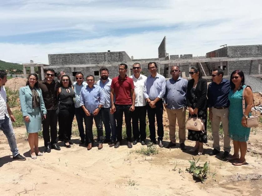 Prefeitos: ação de resistência à pressão política. Abaixo, prefeitos e assessores em frente às obras da Policlínica do Oeste.