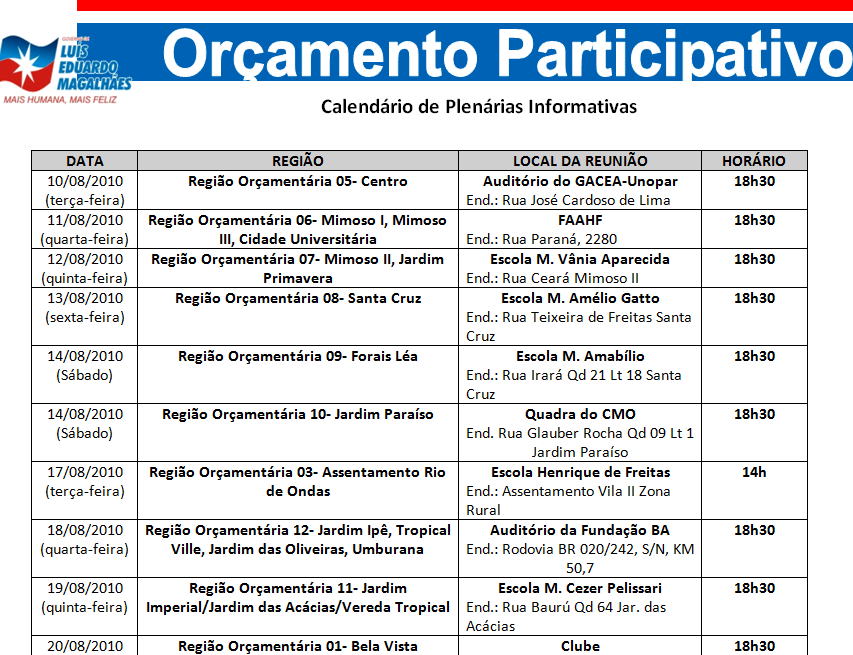 As plenárias se estendem até o dia 16 de setembro, nas demais regiões orçamentárias de Luís Eduardo Magalhães. A ASCOM – Assessoria de Comunicação da Prefeitura Municipal de LEM estará divulgando semanalmente a agenda das demais plenárias.