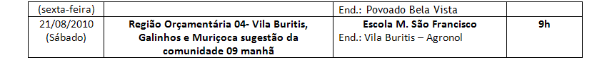 Na quinta-feira, dia 8 de setembro, às 19h, na Escola São Francisco e Vila Buriti, região Orçamentária Vila Buriti, Galinho e Muriçoca.