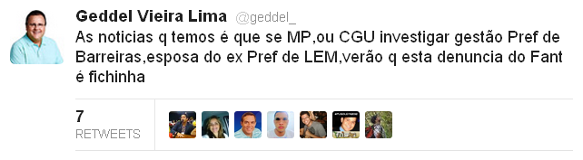 Ontem um representante das oposições de Barreiras viajou para Brasília, levando na bagagem uma farta e volumosa documentação sobre a campanha eleitoral da atual prefeita Jusmari Oliveira. Vai entregar aos produtores da Rede Globo, que solicitaram a documentação para um dos pré-candidatos às eleições majoritárias da cidade. A par disso, uma produtora da emissora afirmou que o material recolhido anteriormente, inclusive com o uso de uma câmara escondida, daria, depois de editado, para fazer um bloco completo do “Fantástico”. É evidente que a Emissora jamais faria isso. Seria atenção demais com o sertão da Bahia.