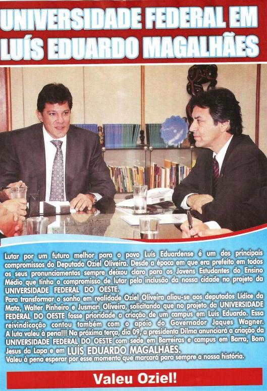 Reconhecemos em nosso Governador Jaques Wagner as sérias intenções de investir na região oeste, haja vista as ações importantes que ele tem desenvolvido para superar os gargalos, bem como as dificuldades enfrentadas por nosso povo, governando com justiça e eficiência a nossa Bahia.