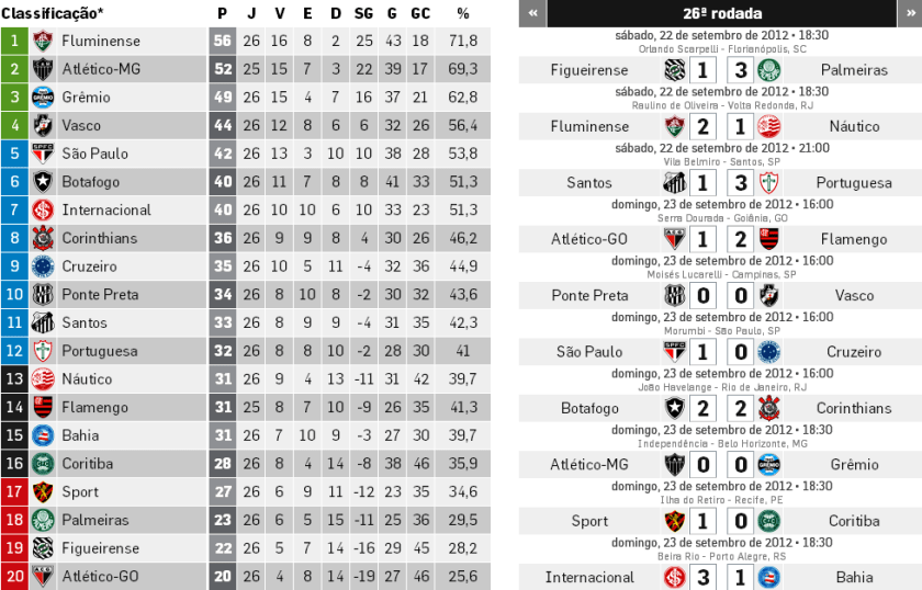 Os dois fatos revelam uma velha lei do futebol: jogador quando quer, faz acontecer. Não existe desequilíbrio técnico que confronte o ânimo do adversário. Veja os resultados da 26ª rodada e a nova tabela de classificação, nos infográficos do Estadão. Clique na imagem para ampliar.