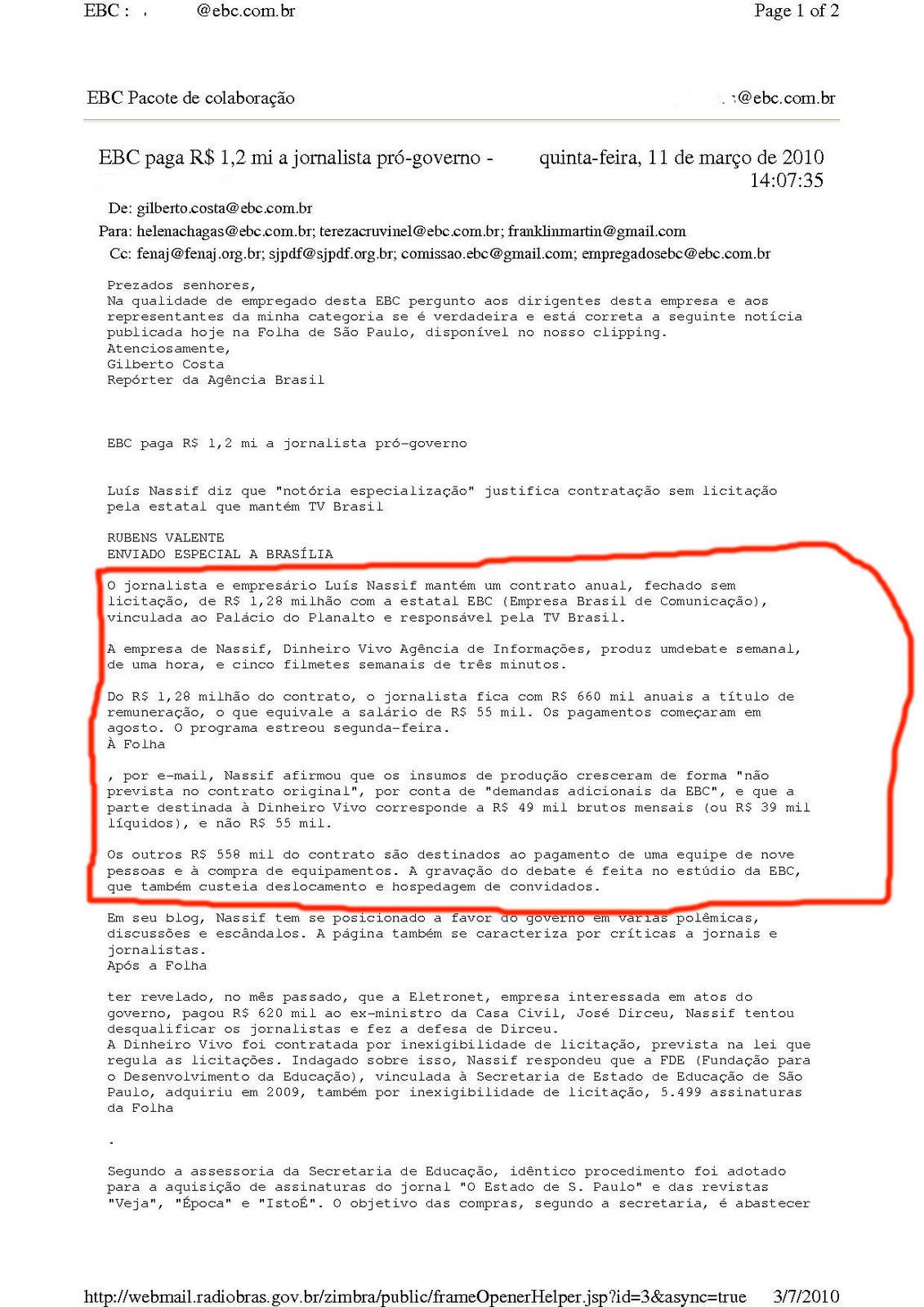 Está correndo os labirintos da internet a imagem reproduzida de um e-mail em que se dá números ao contrato do jornalista Luís Nassif, contratado, sem licitação, pela Empresa Brasileira de Comunicação, para produzir conteúdo de defesa do Governo Luiz Inácio e da candidata Dilma Rousseff. Luís Nassif, junto com Paulo Henrique Amorim e Mino Carta são os denunciantes do que eles apelidaram ser o PIG – Partido da Imprensa Golpista. Segundo os jornalistas contratados, existiria um processo conspiratório para apear Lula do poder, com base nas denuncias do mensalão. O enfrentamento desses mesmos jornalistas com o então governador de São Paulo, José Serra, tem sido cruel e violento. Agora está explicado em números.