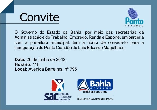 RG, CPF, antecedentes criminais. Todos esses documentos poderão ser feitos em Luís Eduardo Magalhães a partir de hoje com o Ponto Cidadão. O evento de inauguração acontecerá nesta terça-feira, 26, às 11 horas na Avenida Barreiras, número 795 (prédio ao lado do Centro Administrativo). A iniciativa é uma parceria entre a Prefeitura Municipal de Luís Eduardo Magalhães e as secretarias da Administração e do Trabalho, Emprego, Renda e Esporte da Bahia.