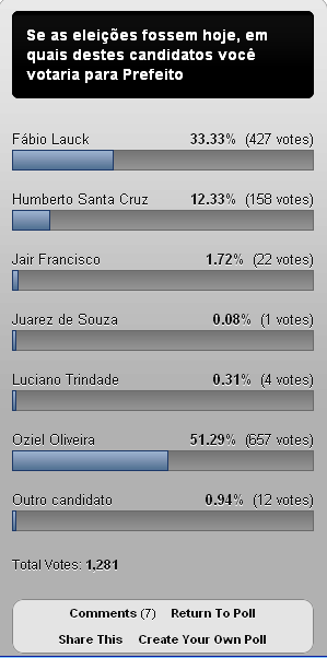 Passa um pouco da meia-noite desta sexta-feira e como prometemos encerramos a enquete virtual sobre as preferências de nossos leitores. Salientamos mais uma vez que nossos leitores não representam, nem de longe, o universo dos eleitores de Luís Eduardo Magalhães. Os assessores de dois pré-candidatos, Oziel Oliveira e Fábio Lauck, parecem ter realizado uma campanha séria pelos votos dos internautas.