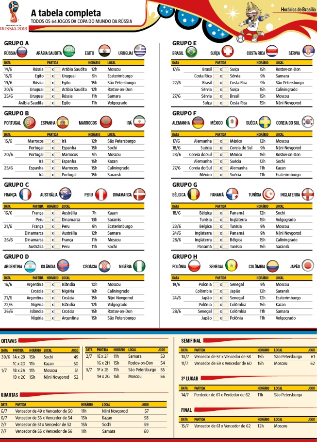 Edição: Aécio Amado, da Agência Brasil. Veja abaixo a tabela de jogos da Copa do Mundo.