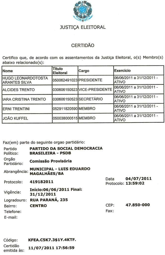Os tucanos de Luís Eduardo Magalhães agora tem nome e endereço do ninho. A Justiça Eleitoral emitiu certidão dos componentes da Comissão Provisória de instalação do Partido na Capital do Agronegócio. Pelos nomes – clique na imagem para ampliar – dá para ver que Eder Fior é a eminência parda do Partido. O sócio, o sogro, a sogra e a esposa participam da comissão diretiva do órgão partidário.
