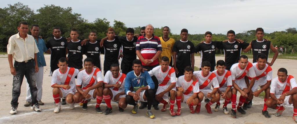 Romualdo posa com as duas equipes de futebol antes do pontapé inicial.