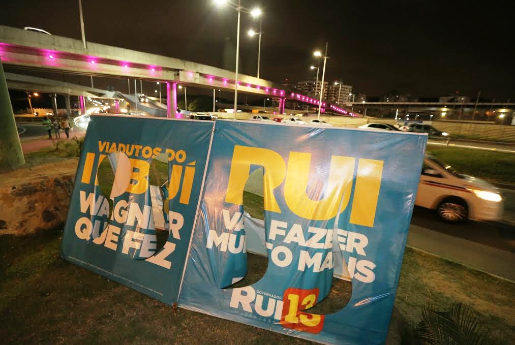 Dezenas de placas de propaganda da campanha de Rui Costa, candidato a governador da coligação Pra Bahia Mudar Mais, foram destruídas ou danificadas nesta sexta-feira (03) em Salvador. O coordenador da campanha da coligação, Carlos Martins, considerou o fato inaceitável.