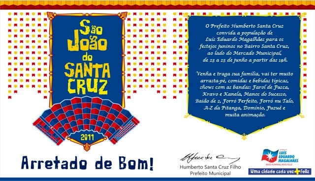 A prefeitura Municipal de Luís Eduardo Magalhães estará disponibilizando ônibus para a população prestigiar o grande São João Municipal que se realizará na praça de eventos do Bairro Santa Cruz ao lado do Mercado Municipal. Nos dias 23, 24 e 25 de Junho de 2011.