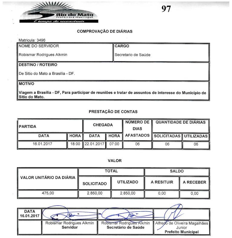 Na última semana de mandato, todos os órgãos públicos já estavam em recesso. Mesmo assim o prefeito autorizou o pagamento do valor de R$ 1.700,00 em diárias para o seu vice-prefeito, conforme processo de pagamento número 1897 de 2016. Além disso, documentos comprovam que o senhor Manoel da Silva Filho estava no município de Sítio do Mato participando da posse do Prefeito Alfredinho Magalhães, no dia 01 de janeiro de 2017.