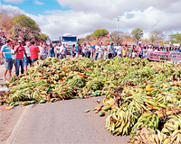Carcaças de animais e bananas foram colocados por agricultores na BR-407, entre as cidades de Filadélfia e Ponto Novo, em protesto pela falta de água na região, que fica a cerca de 330 quilômetros de Salvador.