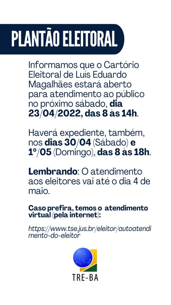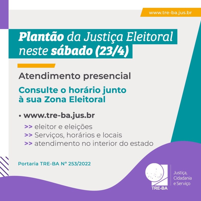 Neste sábado tem plantão no Cartório Eleitoral, das 8 às 14 horas.
