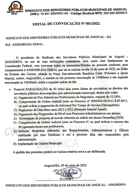 Edital do Sindicato dos Servidores Públicos Municipais de Angical