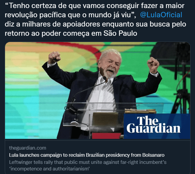 Revolução pacífica: The Guardian reproduz palavras de Lula no lançamento da campanha.