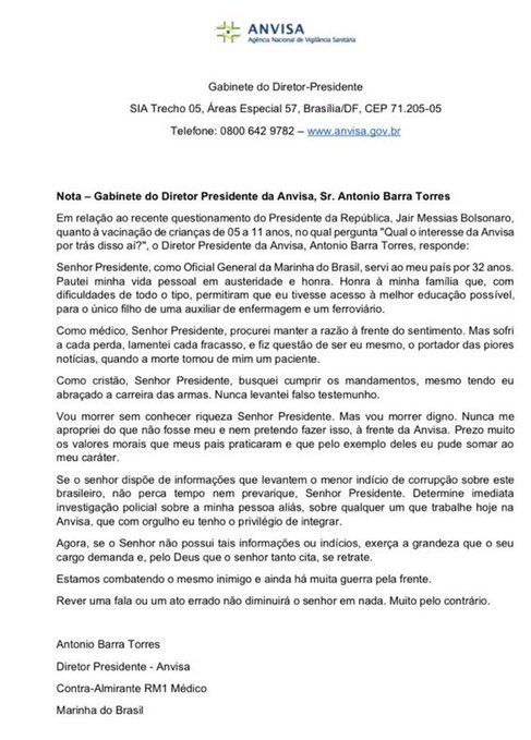 Barra Torres, da ANVISA, diz a Bolsonaro: “Retrate-se!”
