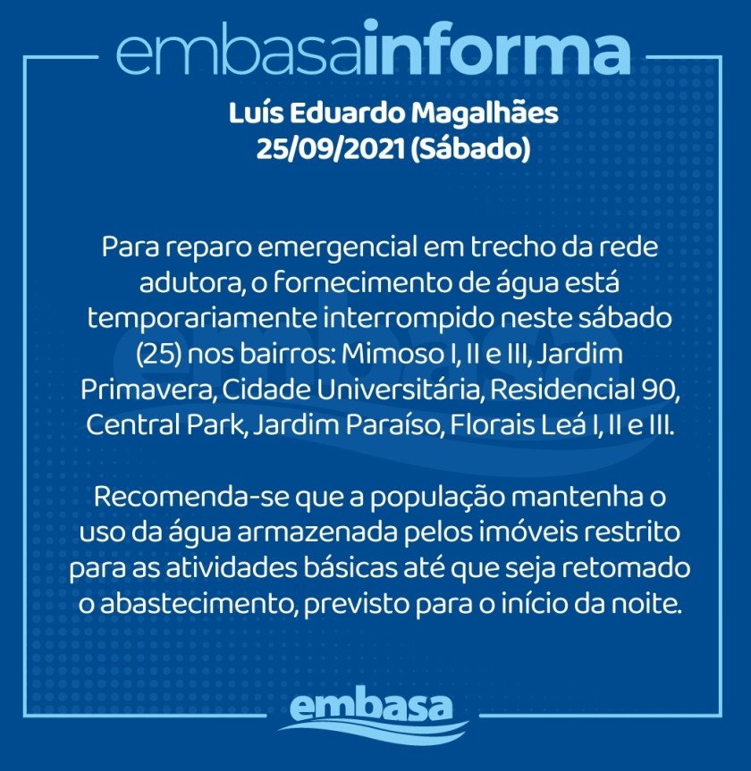 Embasa avisa sobre interrupção de fornecimento neste sábado em Luís Eduardo Magalhães.