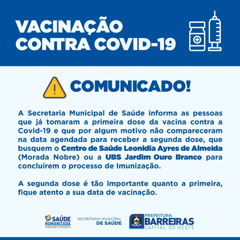 Barreiras está chamando ausentes na 2ª dose da vacina.