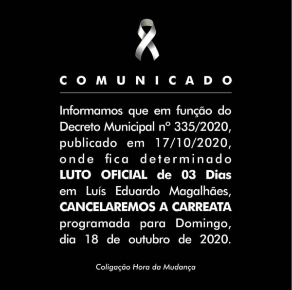 Coligação Hora da Mudança cancela carreata por luto oficial