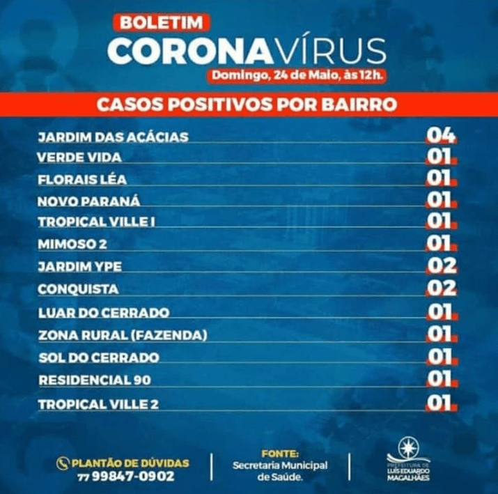 Atenção: distribuição dos casos de Corona por bairro em Luís Eduardo Magalhães.