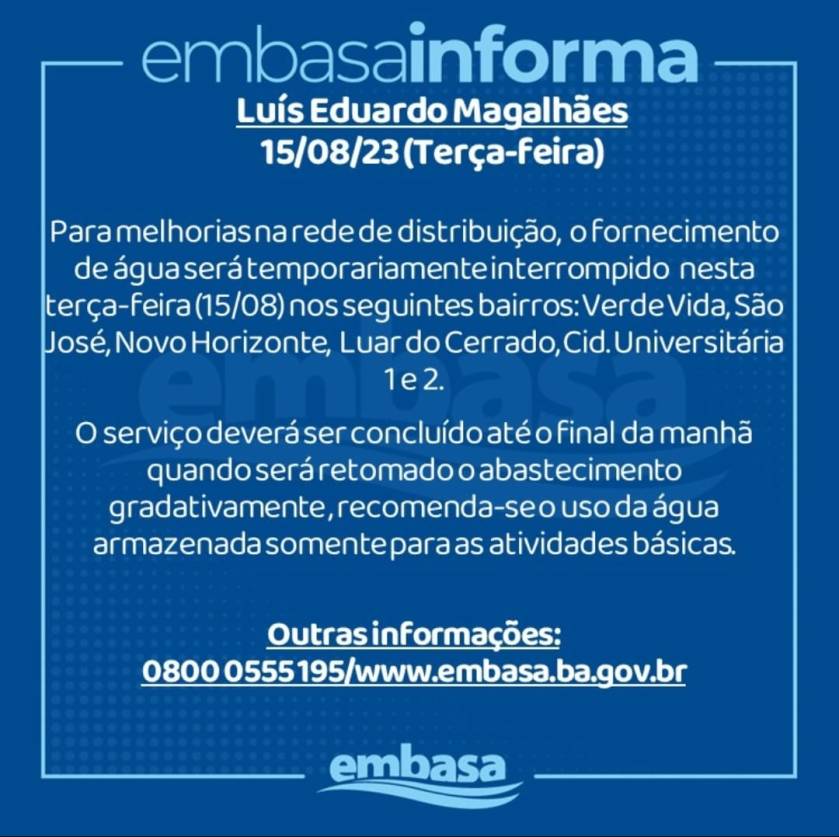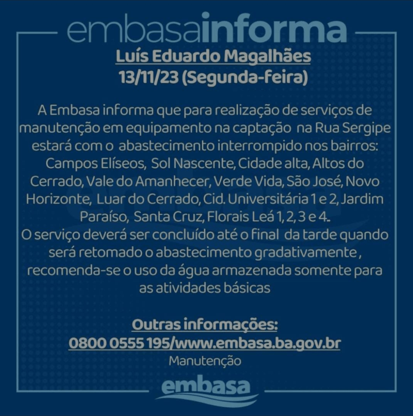 EMBASA avisa que faltará água em diversos bairros da cidade.